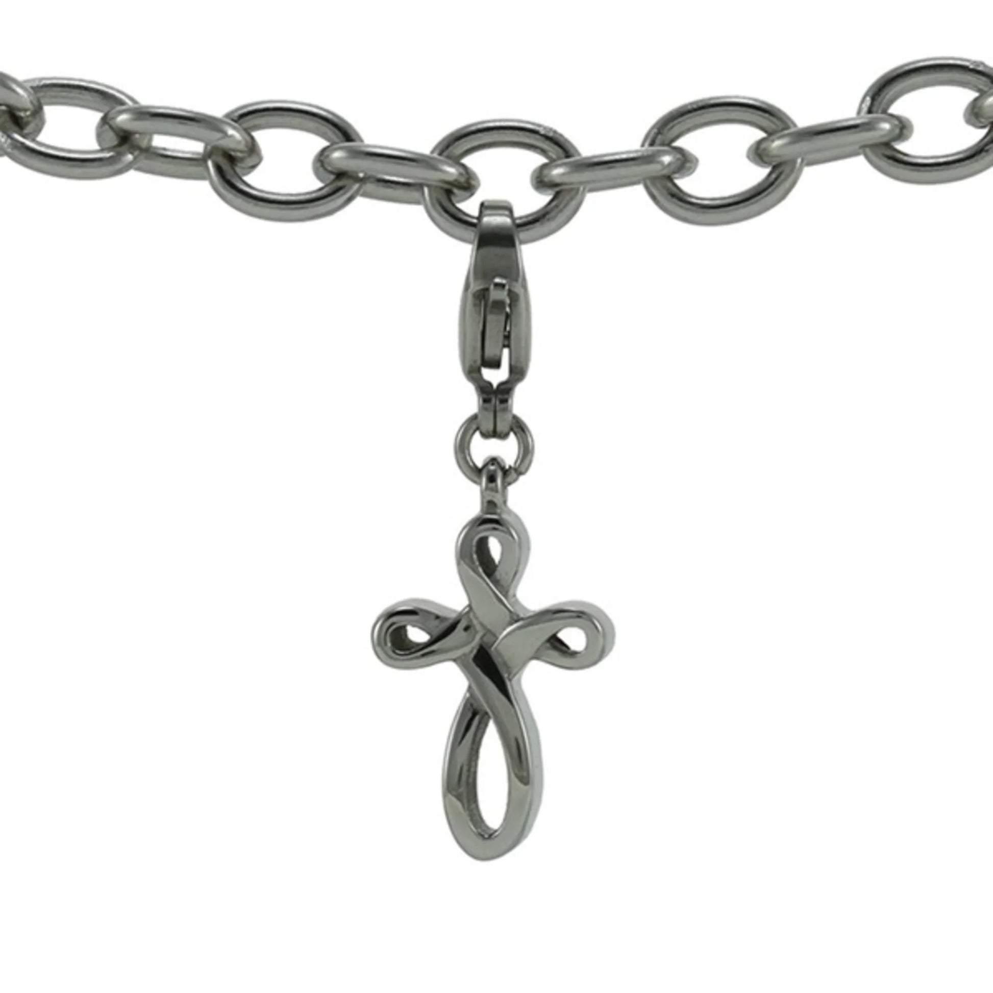 This cremation charm bracelet is made to hold a small amount of ashes so you can carry a quiet symbol of faith and remembrance on your wrist. It pairs a petite metal bracelet with an infinity cross charm, creating a meaningful accent that suits everyday wear. A discreet threaded compartment on the back of the charm stores a nominal amount of cremated remains, and a fill kit is included to make setting it up at home straightforward. The lobster-claw connector allows the charm to attach securely while remaining easy to remove or reposition if needed. The smooth, non-engraved finish invites you to let the shape of the cross itself speak for your loved one's faith, hope, or enduring presence. Soft and subtle, this bracelet offers a gentle way to hold a comforting symbol close throughout the day.