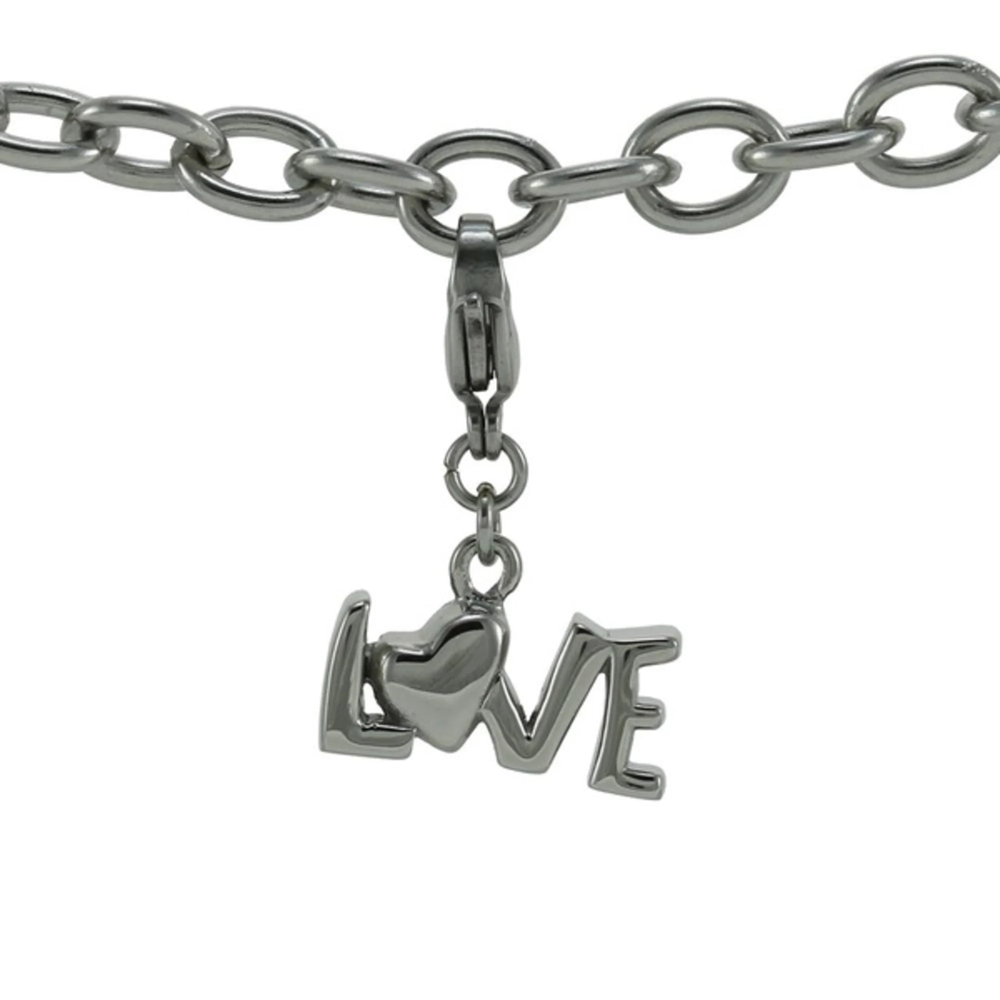 This cremation charm bracelet is created to hold a small amount of ashes so you can carry a gentle reminder of love on your wrist. It combines a petite bracelet with a script-style charm that spells out a loving sentiment, giving the piece a warm, heartfelt feel. A discreet threaded compartment on the back of the charm secures a nominal amount of cremated remains, and a fill kit is included to support simple at-home preparation. The lobster-claw connector allows the charm to fasten easily and stay safely in place while you go about your day. Because the smooth surface is not designed for engraving, the word itself becomes the personal message you carry, reflecting the bond that continues even after loss. Light and unobtrusive, this bracelet offers a soft, steady way to keep that love close.
