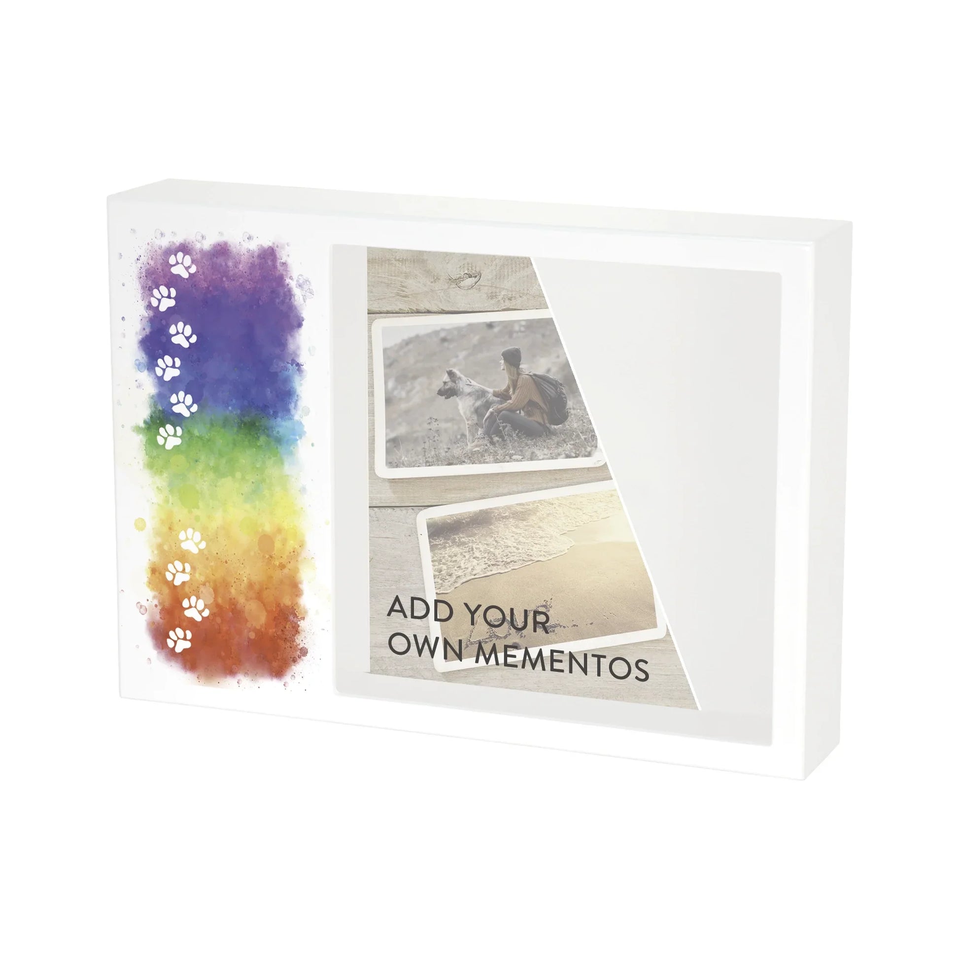 This shadowbox-style urn offers a gentle rainbow path design for honoring a beloved pet at home. The front display space lets you arrange photos and mementos along the artwork, creating a small pathway of memories you can see every day. Behind the display, a hidden compartment with a sliding panel holds up to 70 cubic inches of ashes, keeping them secure and sheltered from view. With overall dimensions of 10.94 x 2.75 x 15.44 inches, the MDF frame can be placed on a shelf or mounted on a wall to suit your room. You can personalize this tribute by choosing which moments to highlight and by pairing it with candles, flowers, or other small keepsakes nearby. The soft colors and simple lines are meant to bring a quiet sense of hope whenever your eyes follow the path across the frame.