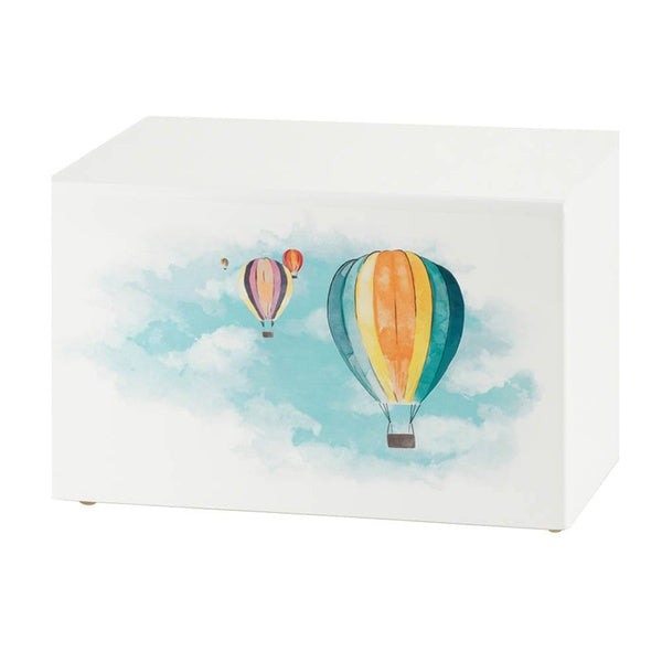 This bright white urn offers a light, uplifting way to remember someone whose spirit you picture soaring free. The high-gloss MDF body has a smooth, modern shape, while the full front panel displays a hand-painted watercolor hot air balloon drifting through the sky. Inside, there is standard adult capacity of about 200 cubic inches, sized to hold a remains bag and tie within a compact 5.5 by 9 by 6.25 inch form. A sliding bottom panel secured with a single screw keeps the ashes safely enclosed and makes sealing the urn straightforward. Black engraving for a name, dates, or a short phrase can be added, turning the gentle balloon scene into a personal symbol of freedom, adventure, and lasting love.