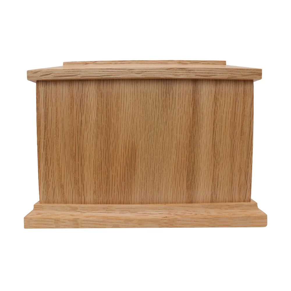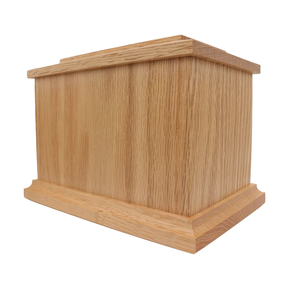 This oak pet urn combines a rectangular photo window with an engraved base area to create a balanced tribute for your companion's ashes. It is crafted from authentic North American oak hardwood and finished with a clear, durable coat that highlights the natural grain without stain. The generous rectangular opening on the front holds a favorite photo, while the smooth base below is designed to carry your engraved name and dates. Ingenious screw-free construction and felt-lined feet make filling the urn and placing it on a shelf, mantle, or table both simple and secure. Offered in capacities of roughly 30, 70, and 120 cubic inches with personalization included, it can be chosen to fit your pet and the words you wish to share. It offers a thoughtful, grounded place to return to whenever you want to feel close to your pet again.