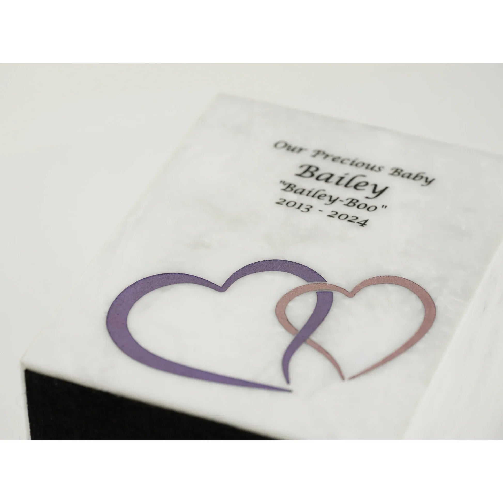 This marble cremation urn offers a soft, uplifting way to remember a beloved pet. Gentle pink hearts rest on smooth white stone, creating a bright yet calming look that feels at home in many styles of décor. Handcrafted from marble, it is sized to hold up to 47 cubic inches of ashes and stands about 5 inches tall, giving you a compact memorial that is easy to display. A carefully threaded base helps keep the ashes secure, providing quiet reassurance day after day. You may choose to personalize the display with a name, dates, or small mementos arranged nearby to tell your pet's story. This piece is meant to offer a tender, steady reminder of the joy your companion brought to your life.