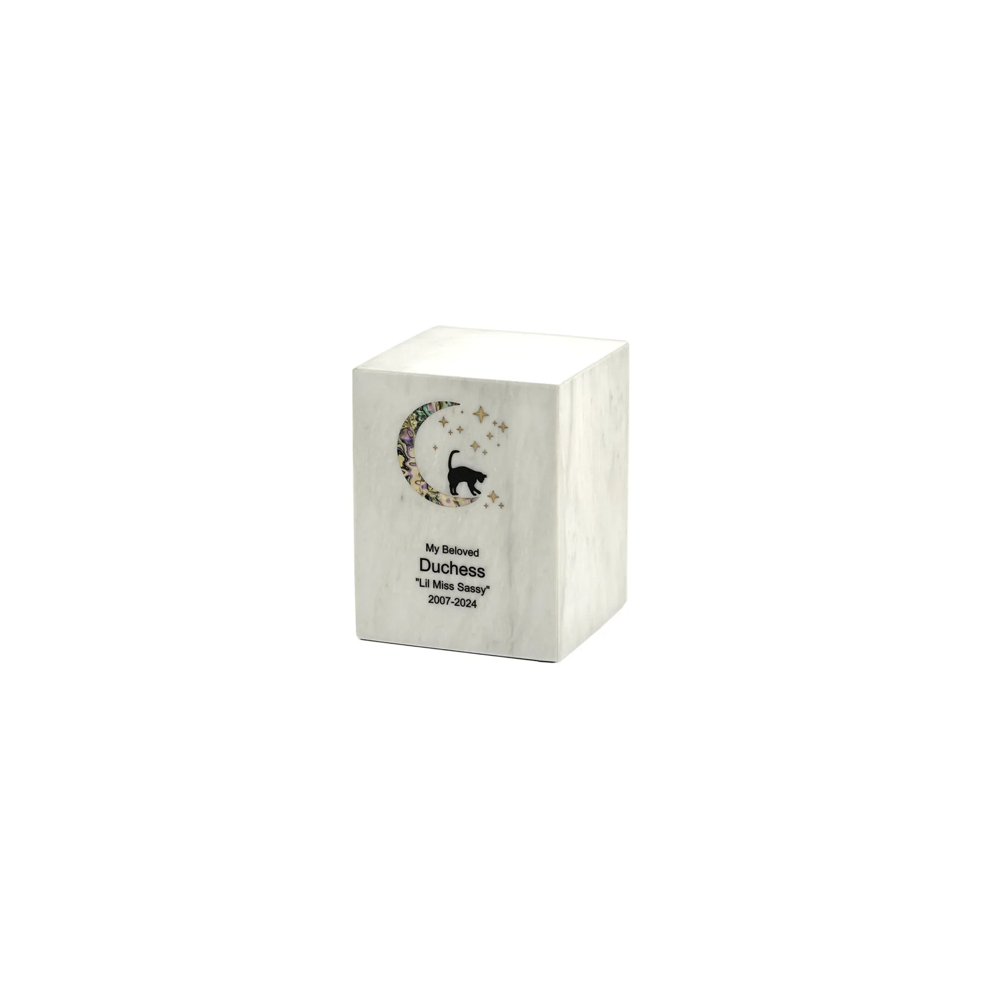 This marble cremation urn is created to celebrate the memory of a treasured cat or small pet. A serene cat and crescent moon motif in soft pink inlay is set against smooth white stone, giving the piece a light, comforting look that recalls peaceful nights together. Made from solid marble, it is designed to hold up to 47 cubic inches of ashes and stands about 5 inches tall, making it simple to place in a spot that feels special to you. A secure threaded base keeps the ashes safely enclosed, so you can focus on remembering rather than worrying about the container. Many people like to personalize this urn with engraving or surround it with candles and keepsakes that reflect their pet's personality. The gentle imagery and compact size create a soothing focal point for reflection whenever you need a moment of quiet.