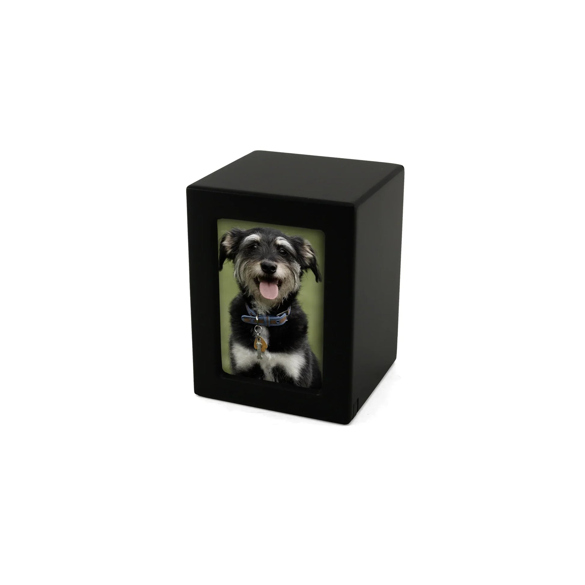 This extra-small photo memorial box provides a discreet, modern place to hold a favorite picture and a small amount of ashes together. Crafted from MDF with a smooth, black-style finish, it features a front opening for a treasured photo and a hidden compartment behind to keep about 40 cubic inches of ashes secure. Its compact footprint makes it easy to tuck onto a shelf, bedside table, or small corner of a room without overwhelming the space. The clean lines and understated color let the image and memories take center stage. This piece offers a gentle way to remember a dear companion, keeping both their likeness and a tangible reminder close by.