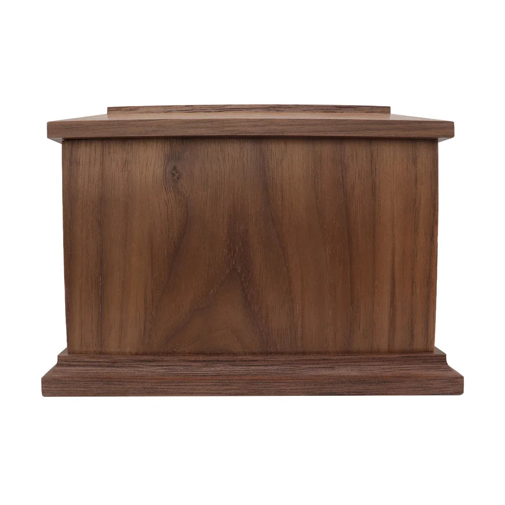 Handcrafted from authentic North American walnut, this urn showcases rich cocoa hues and elegant grain figure. The Side Oval walnut urn balances an off center oval window with open space for engraving, producing a refined, gallery style look. It is sealed with a clear protective topcoat never stained so the natural beauty of the wood is what you see. A precision, screw free panel on the underside makes adding ashes quick and secure. Felt lined feet reduce slipping and guard against scratches. Select a capacity of 30, 70, or 120 cubic inches and personalize to make it yours.