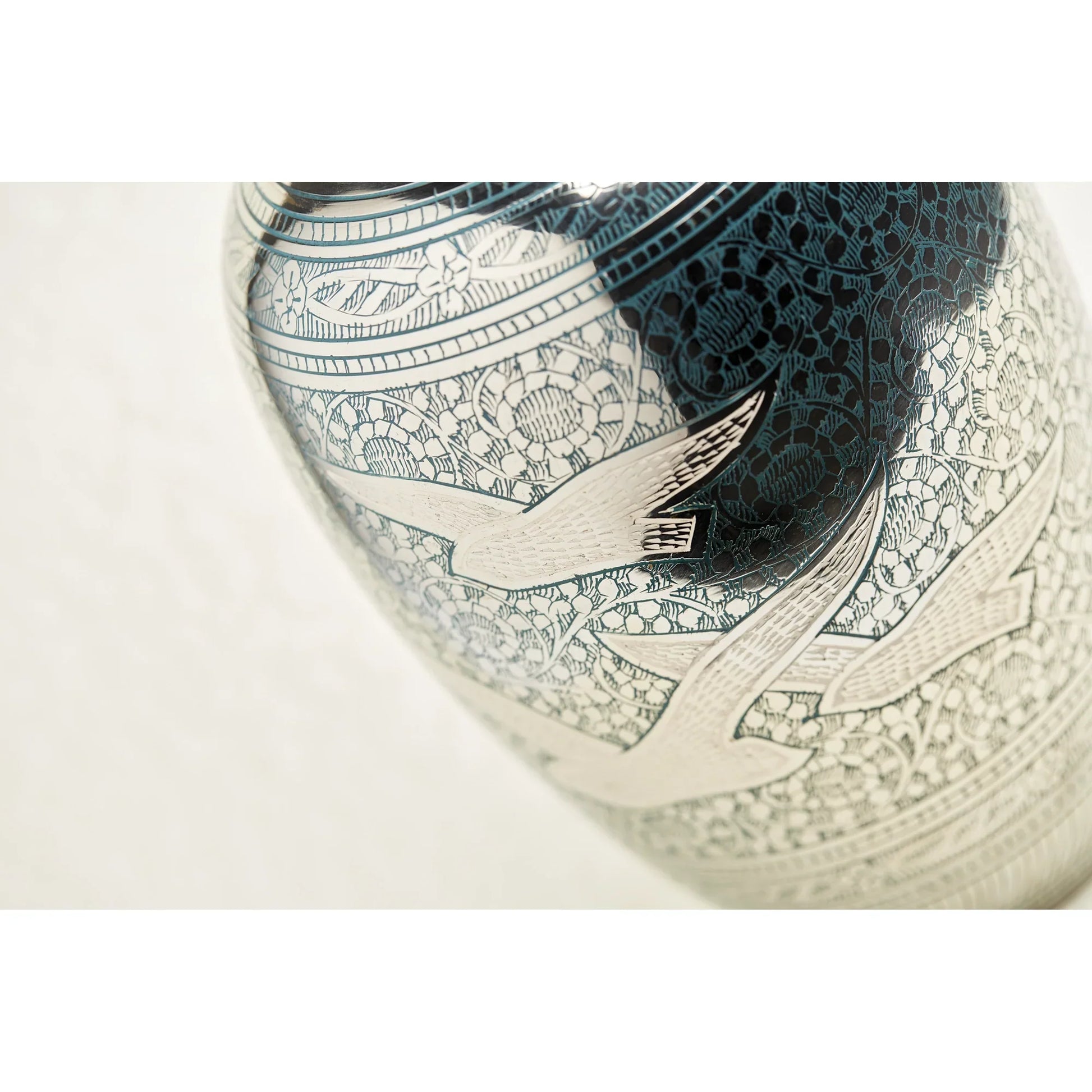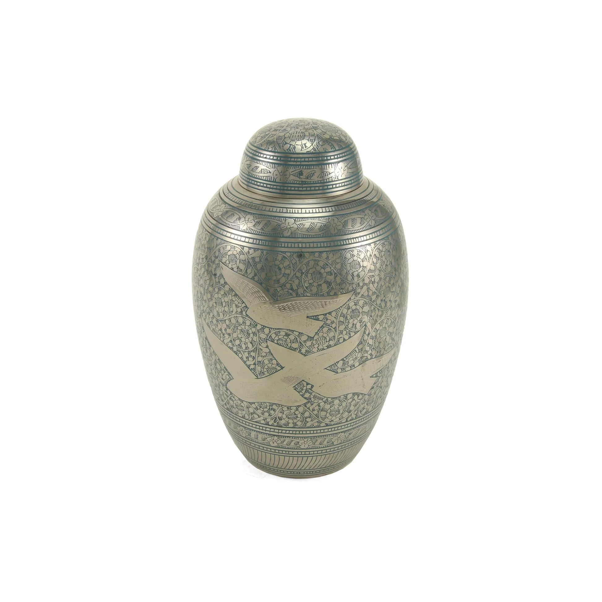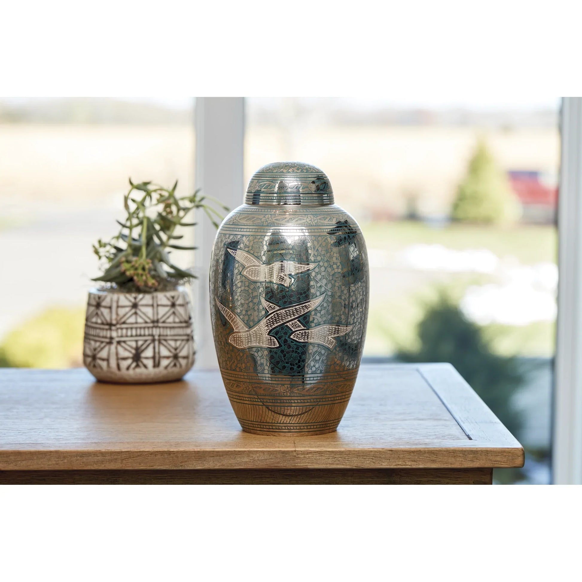 This full-size cremation urn provides a timeless resting place that gently suggests the idea of a peaceful journey. Made from brass with a polished finish and an engraved design of birds in flight, it carries a sense of movement and uplift without feeling elaborate. The interior capacity is suited for one adult, offering about 200 cubic inches of space with a threaded lid that helps keep the ashes securely contained. Its classic shape and reflective surface allow it to sit gracefully on a mantle, shelf, or in a niche alongside photographs or other mementos. Engraving can be added to include a name, dates, or a brief phrase, pairing meaningful words with the flight motif. This urn offers a gentle reminder of release, hope, and continuing love each time you pause beside it.