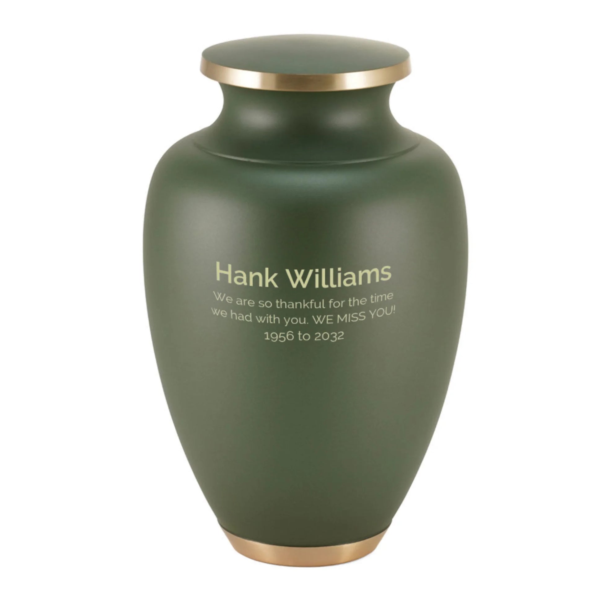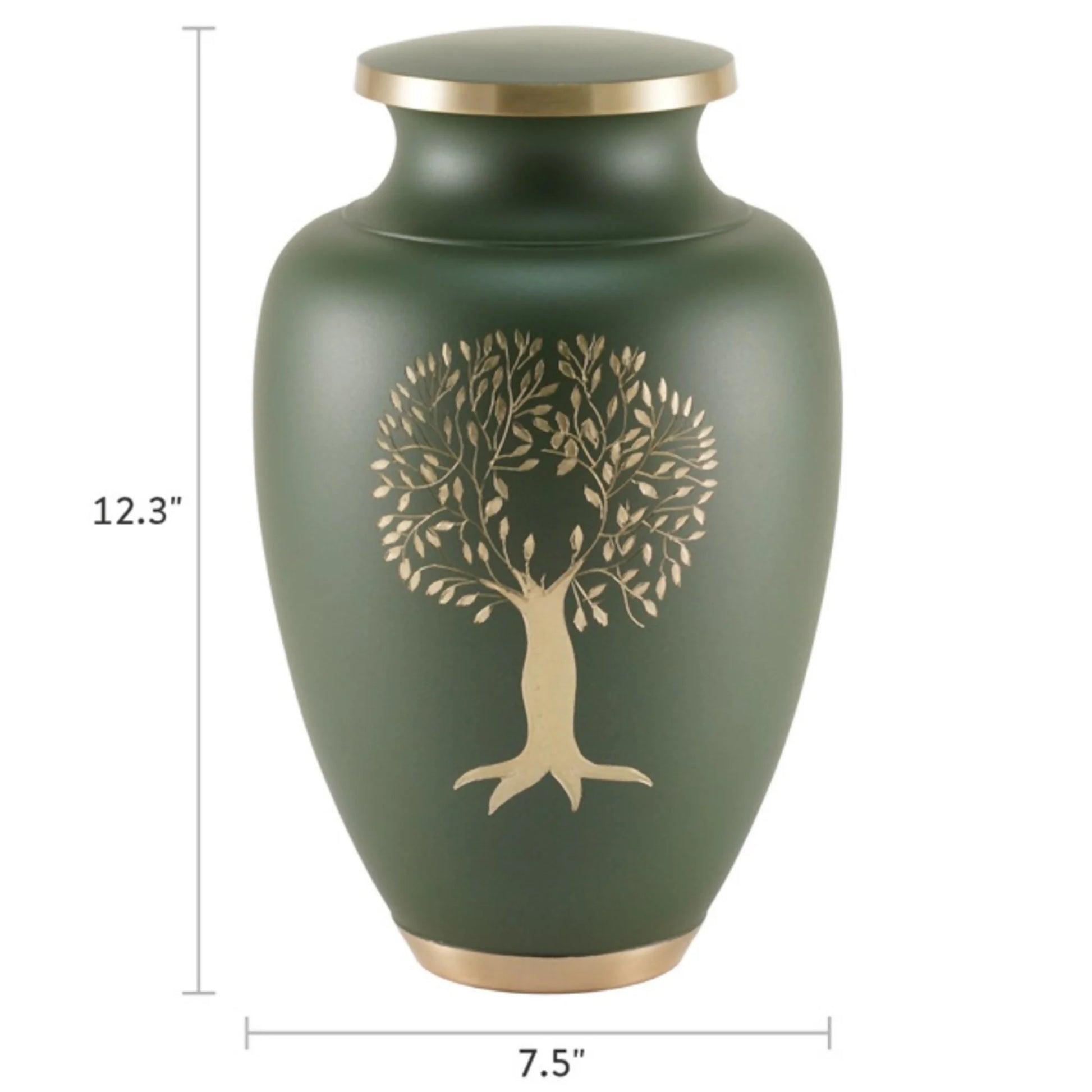 This extra-large cremation urn provides generous space to honor a loved one while allowing room for keepsakes or shared ashes. Crafted from brass with a muted matte green finish, it features a delicately engraved tree of life motif that symbolizes strength, connection, and growth. The roomy interior holds around 320 cubic inches, making it suitable for larger needs or for including letters, notes, or small mementos alongside the ashes. A secure threaded lid helps keep the contents safely in place, and the taller profile sits comfortably on a mantel, table, or in a niche. Discreet personalization is available so you can add a name, dates, or short inscription that reflects the person you are remembering. With its calm color and meaningful design, it offers a stable, comforting focal point for family and friends.
